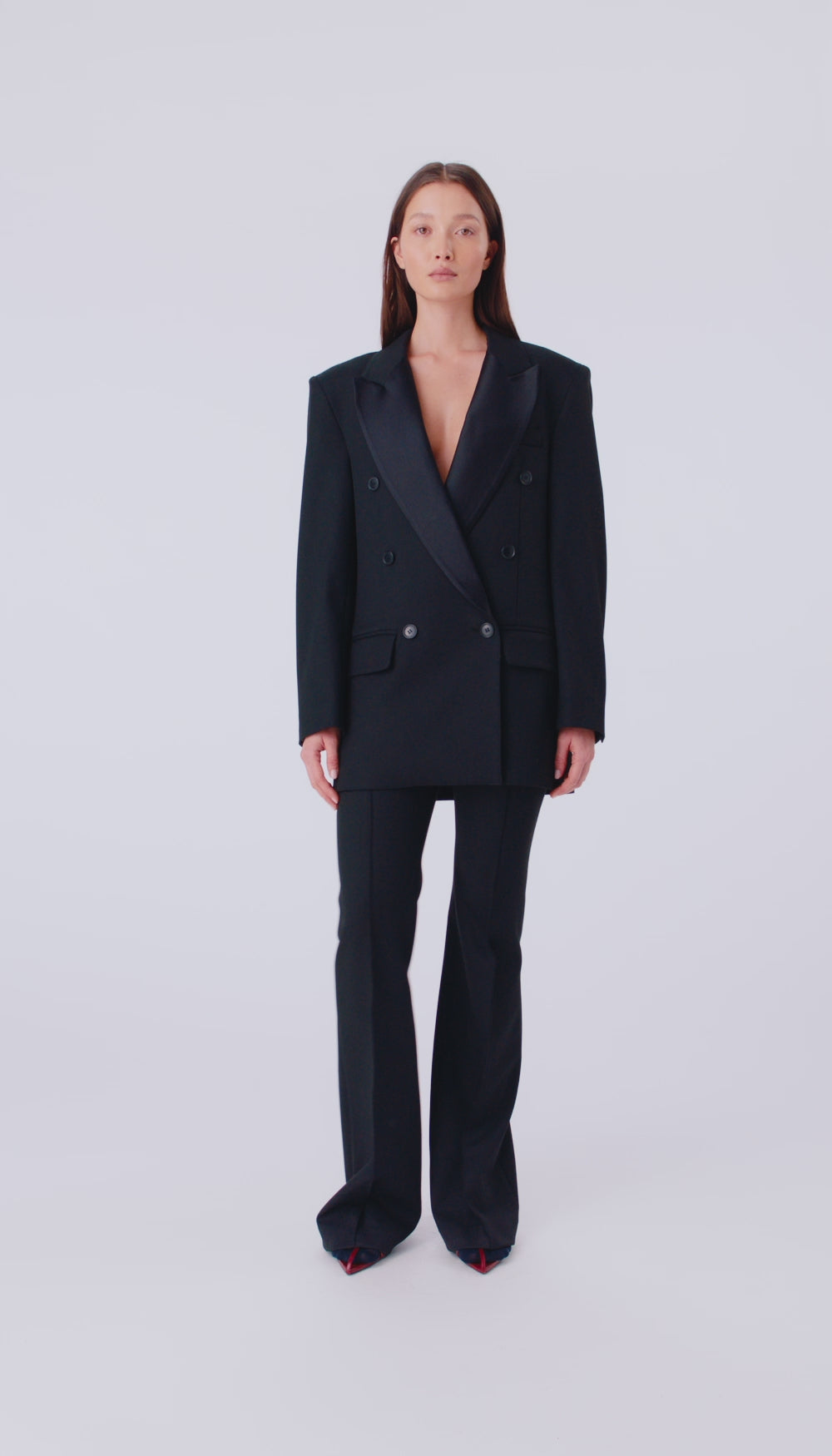 Details: A longline silhouette, this oversized double-breasted blazer features an extra-long contrast lapel and low pocket placement to emphasize its louche nature. This garment is oversized, consider sizing down.