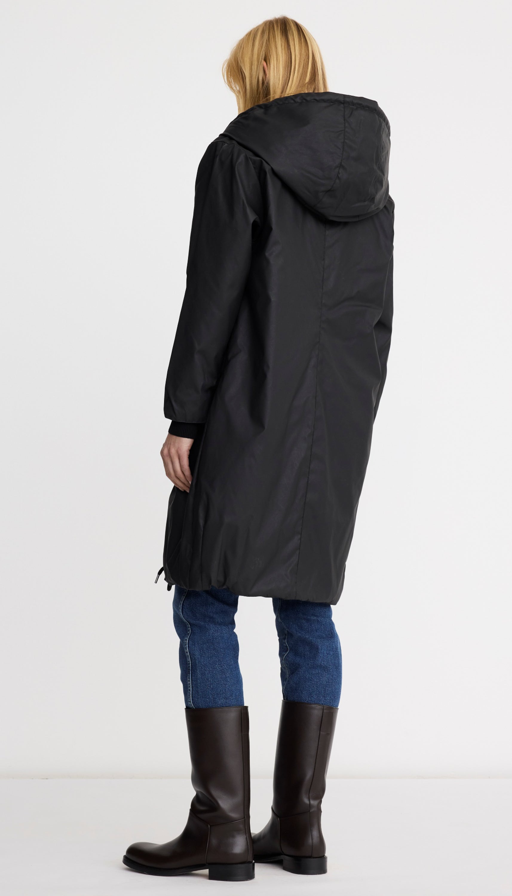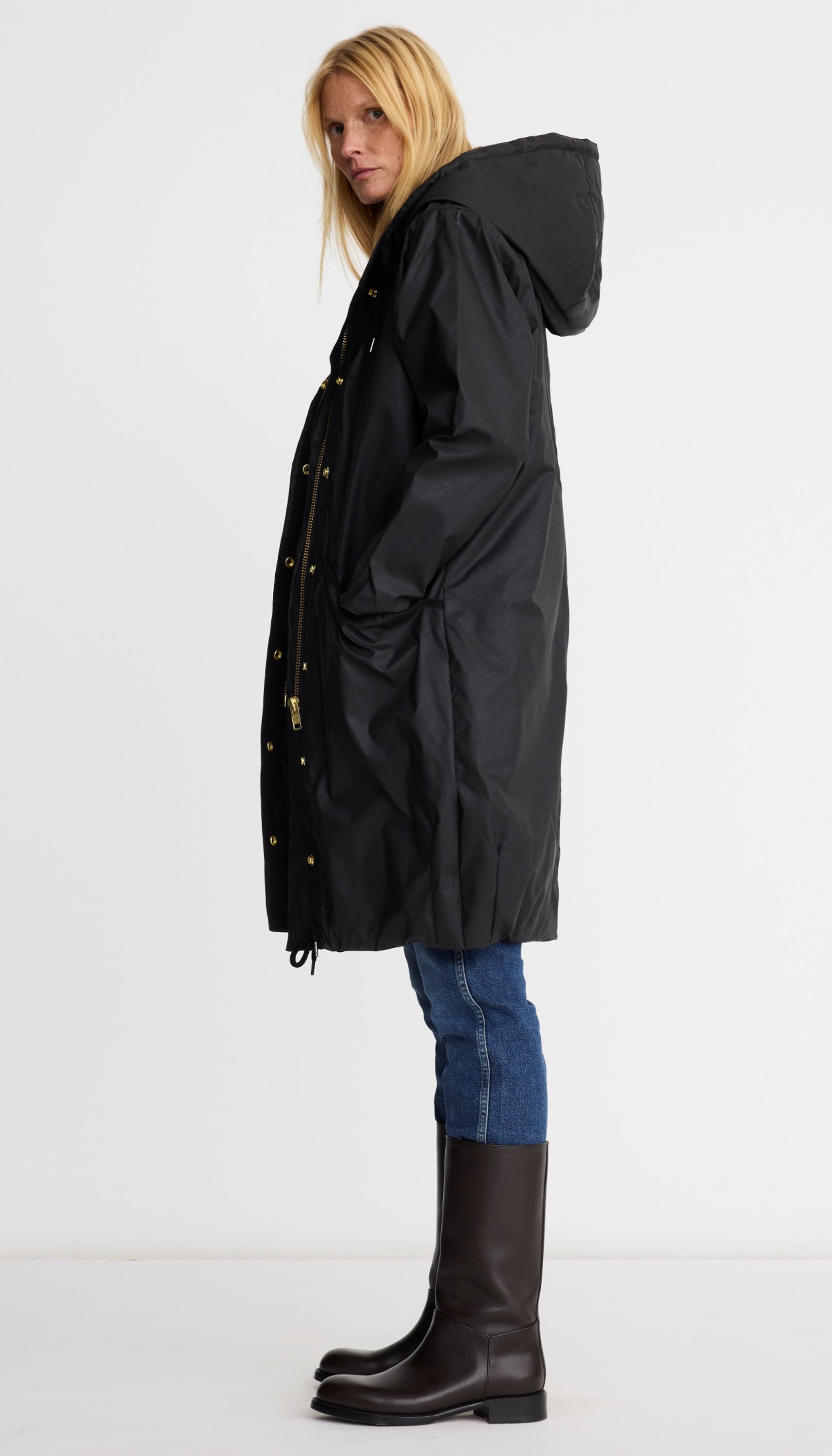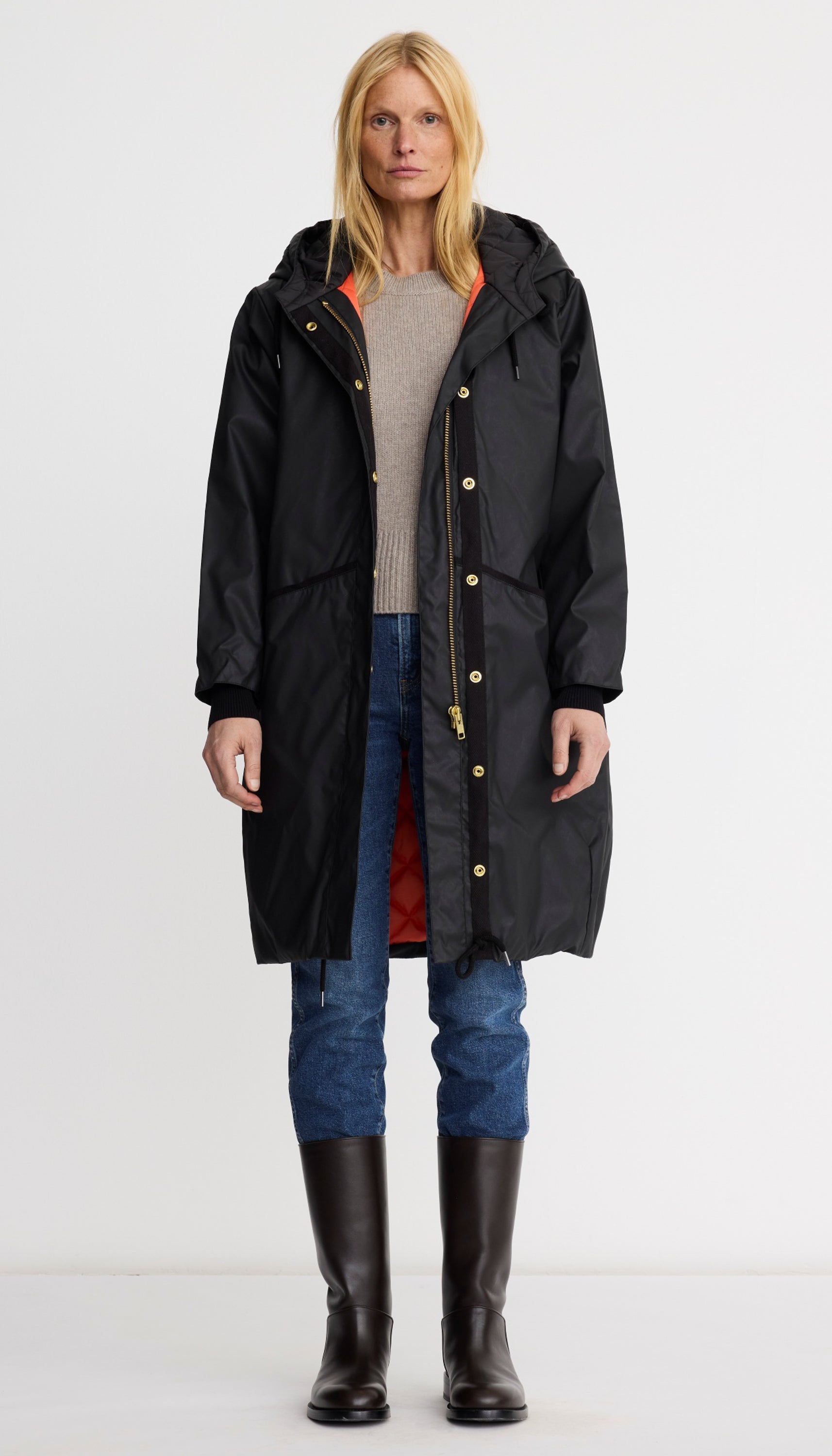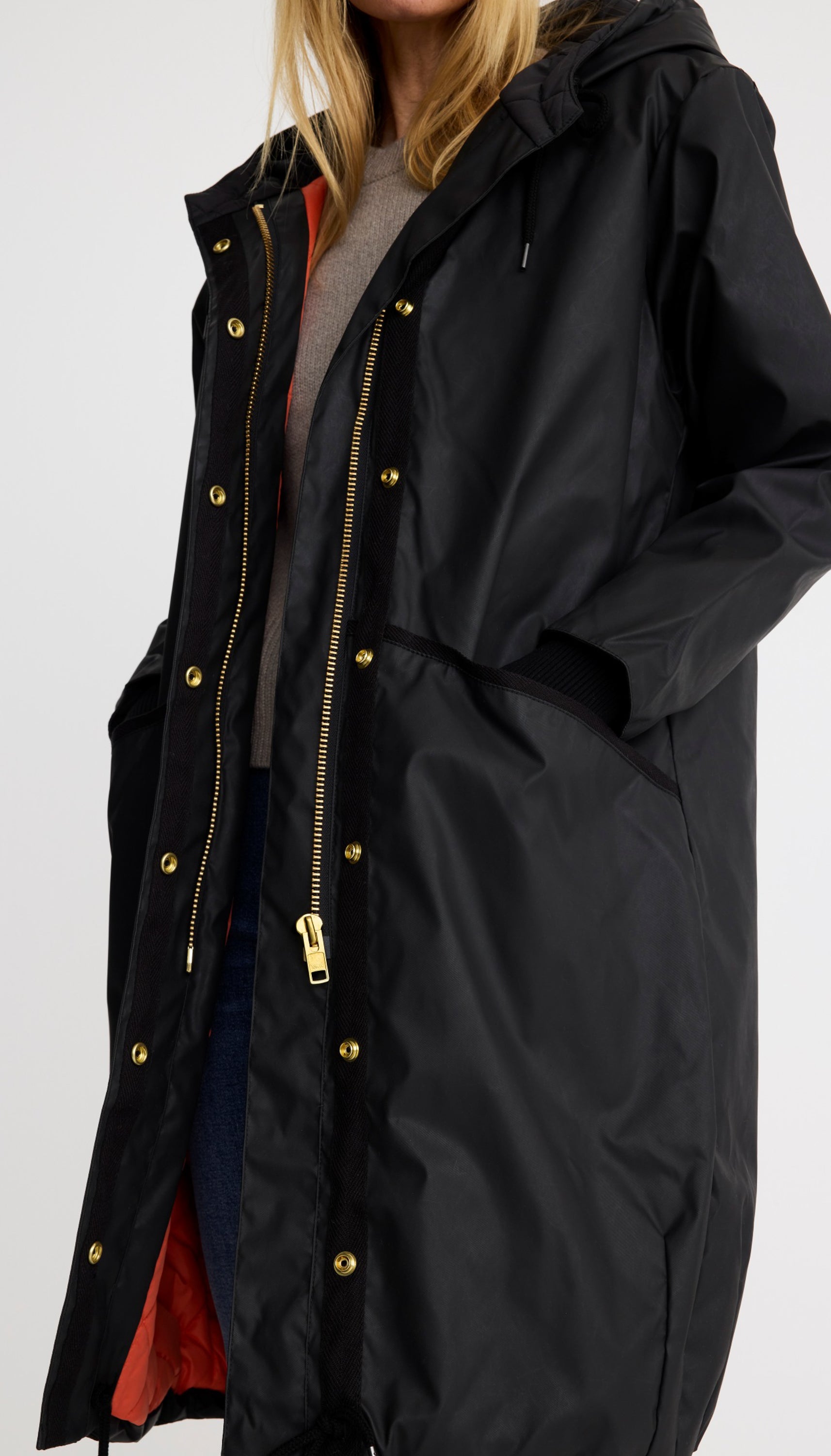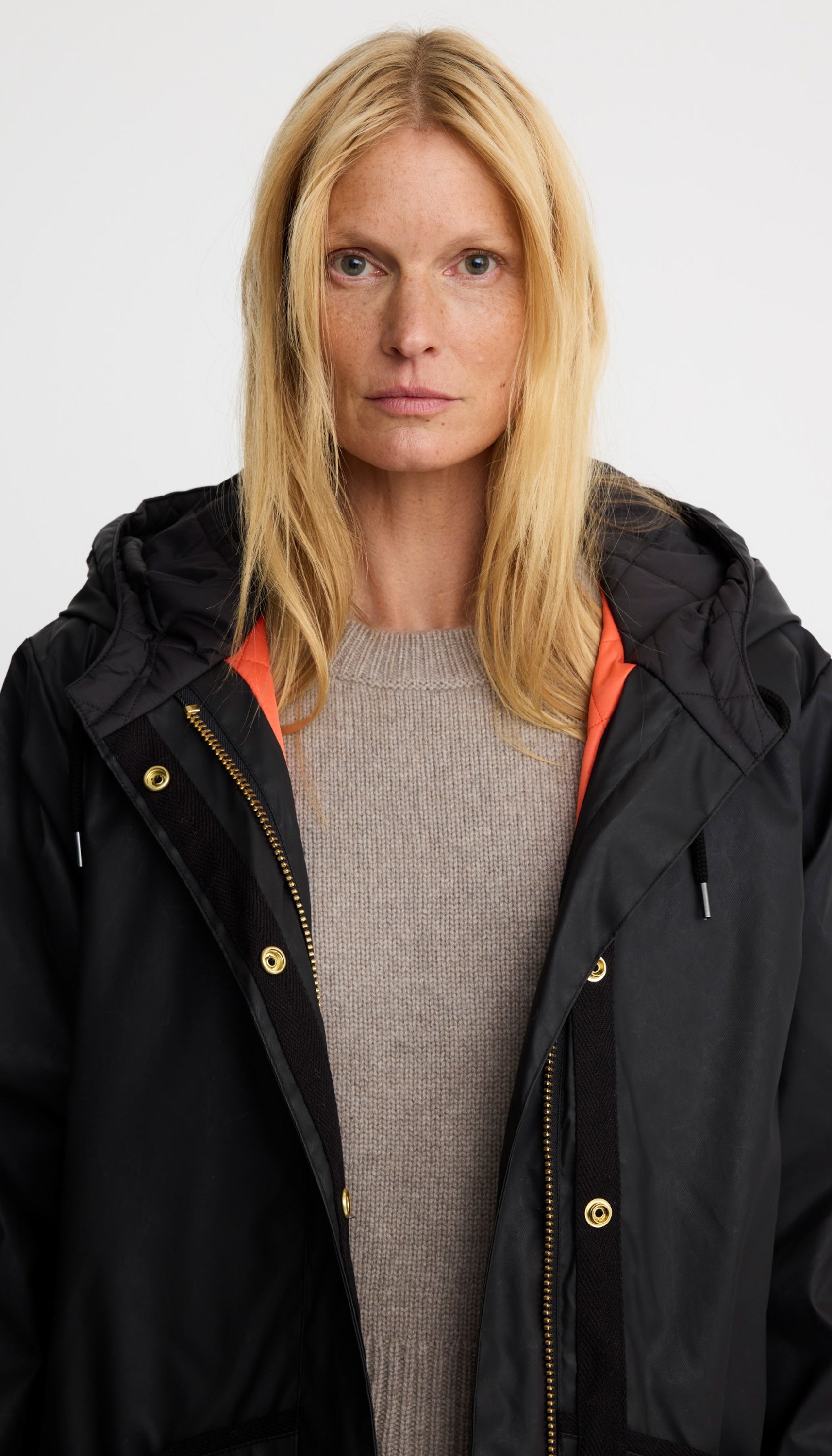 Details: A relaxed fit, this water-resistant coat features an orange quilted lining, oversized pockets, and an extra-large drawstring hood that cinches. Over time, distinctive markings (the hallmark of a coated fabric) will develop and should be embraced. An interior pocket has been added to protect your phone in inclement weather. Brass hardware makes this special and SMYTHE.  This garment fits true to size, take your usual size.