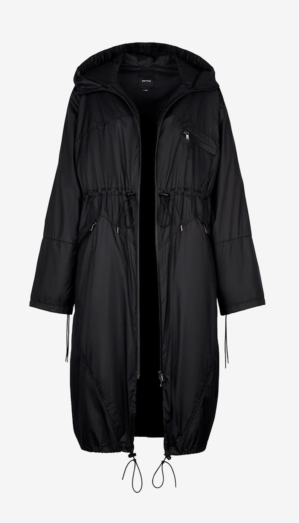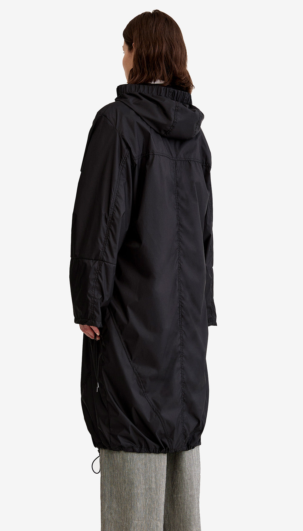 Details: Oversized with a dropped armhole, this new water-resistant shell features an elasticized hood, drawstrings at the waist, sleeves and hem with a two-way zipper. This garment fits true to size, take your usual size.