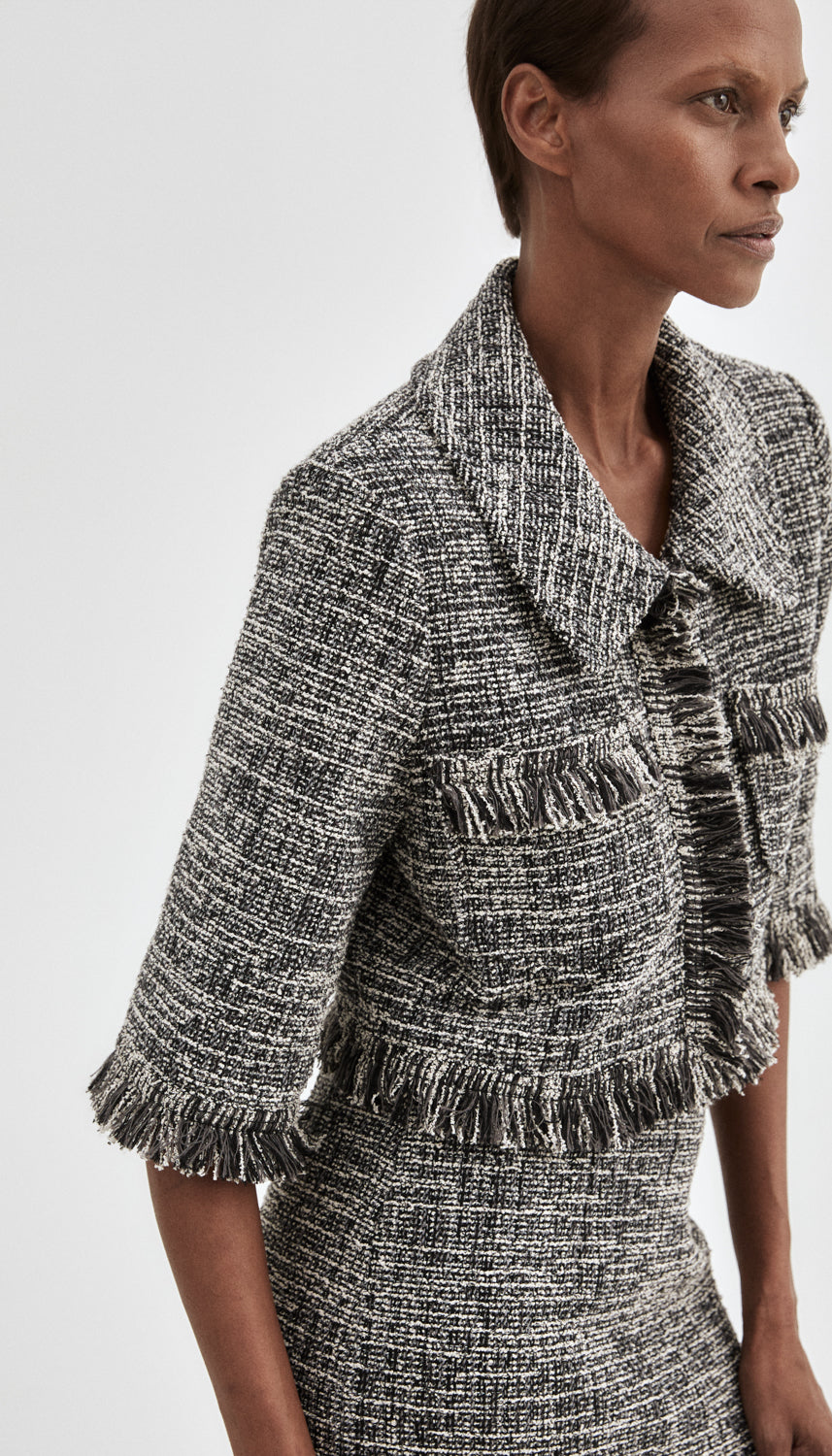 Style Notes: The Cropped Sleeve Mini Jacket plays with scale in a way that feels instinctive rather than styled. Pair it with wide-leg denim or a fluid trouser for contrast, or wear it with its coordinating skirt for a refined, statement-making look.