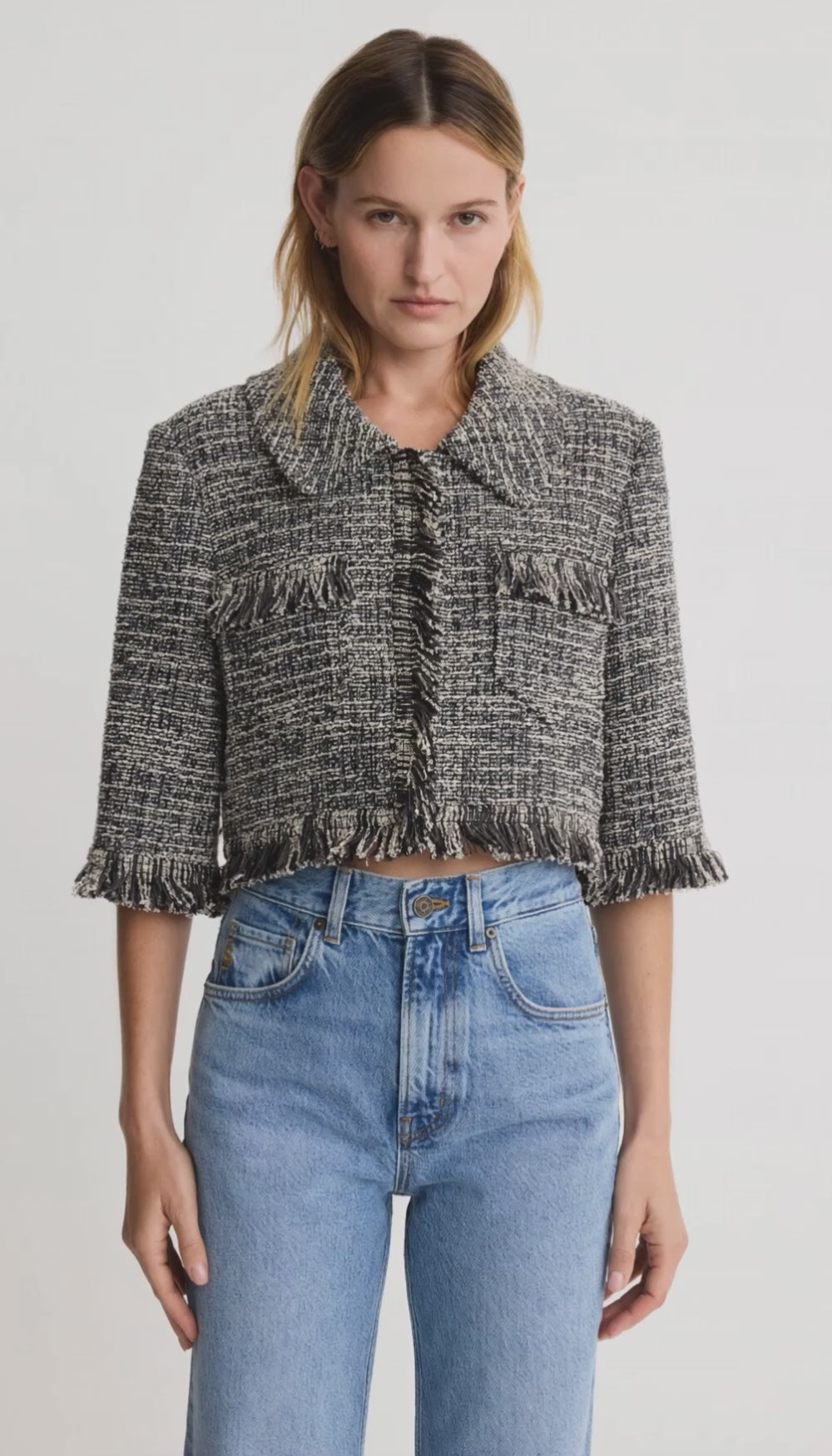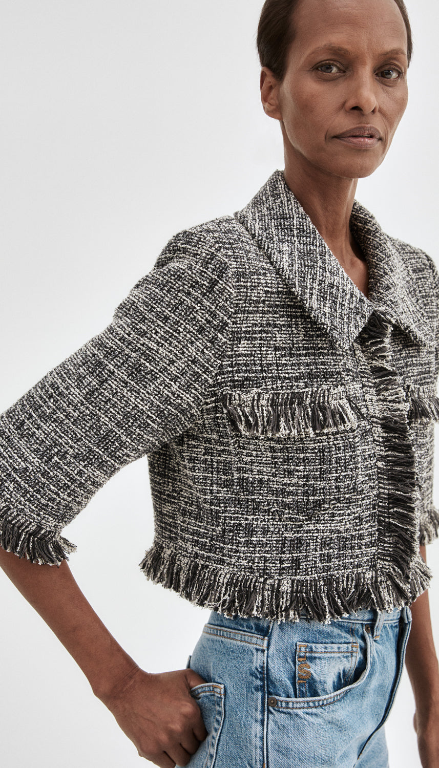 Details: Moderately tailored with a cropped boxy fit, this new jacket silhouette features fringe trim and hook and eye closures.