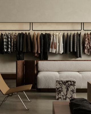 Opened in 2024 and located at the CF Chinook Centre in Calgary, this boutique brings SMYTHE’s confident point of view to Alberta with quiet authority. Warm plaster walls, rich wood, sculptural stone, and thoughtful vintage touches create a composed, welcoming space where tailoring naturally takes center stage.
