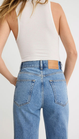 High rise with a wide leg, this waist is intended to sit above the belly button. This non-stretch denim features felled center front and back seams, a hammer loop and classic back patch pockets in a vintage mid-blue wash.