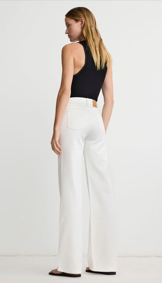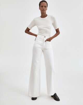 High rise with a wide leg, this waist is intended to sit above the belly button. This non-stretch denim features oversize front patch pockets and classic back patch pockets in a white wash.