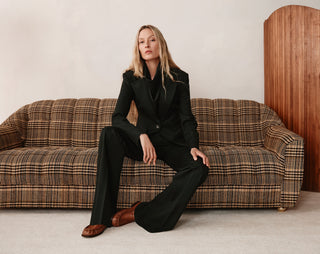 Tweed, plaid, and herringbone meet sculpted sleeves, curved seams, and domed metal buttons. Forest greens and browns anchor a modern countryside mood. Tradition never looked this directional.