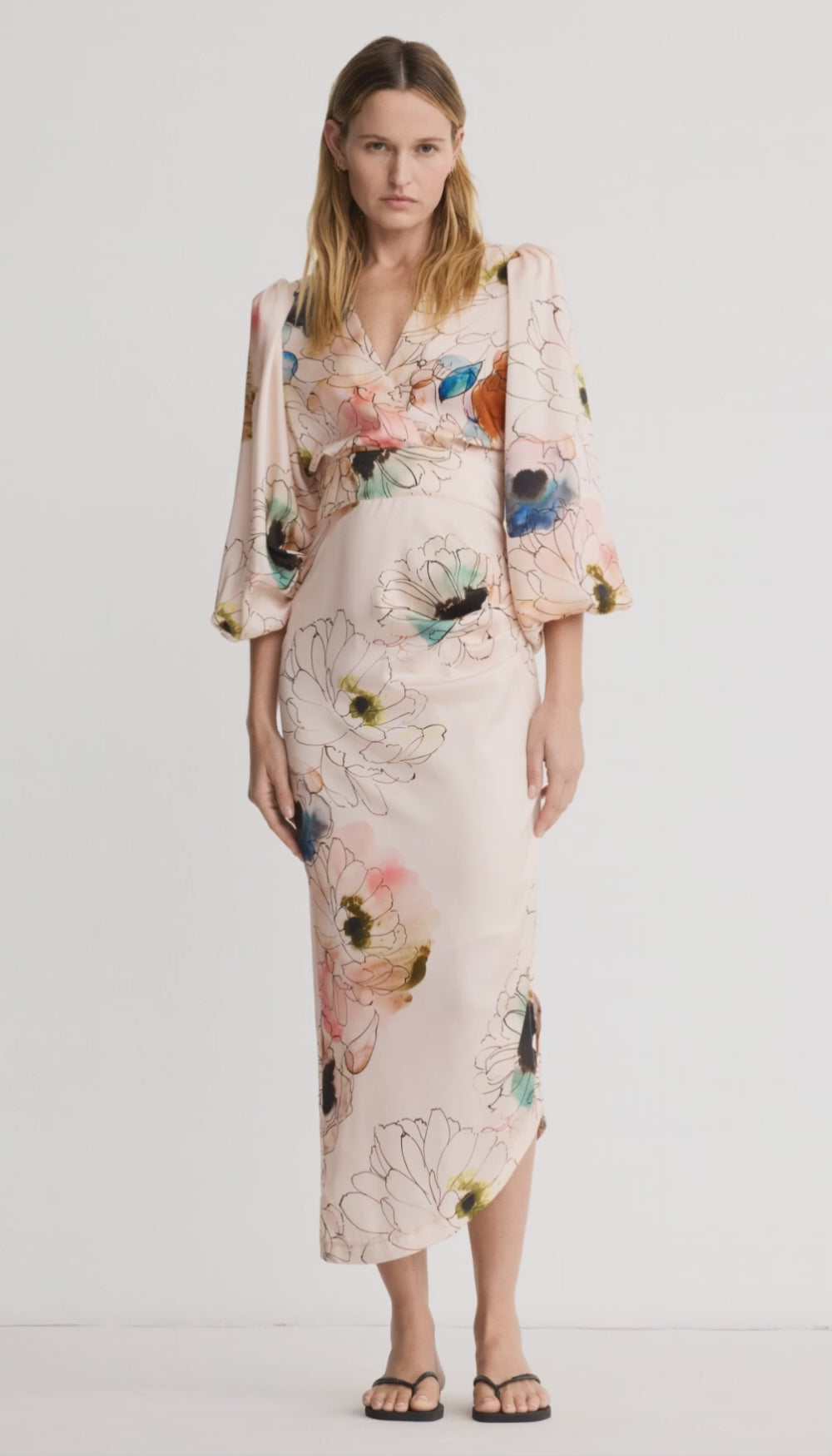 Details: Fitted through the waist and hips, this dress silhouette features a surplice blouson top with shirred shoulders and a draped asymmetrical skirt. It has been updated with subtle elasticized balloon sleeves. Curvy figures may wish to go up a size.