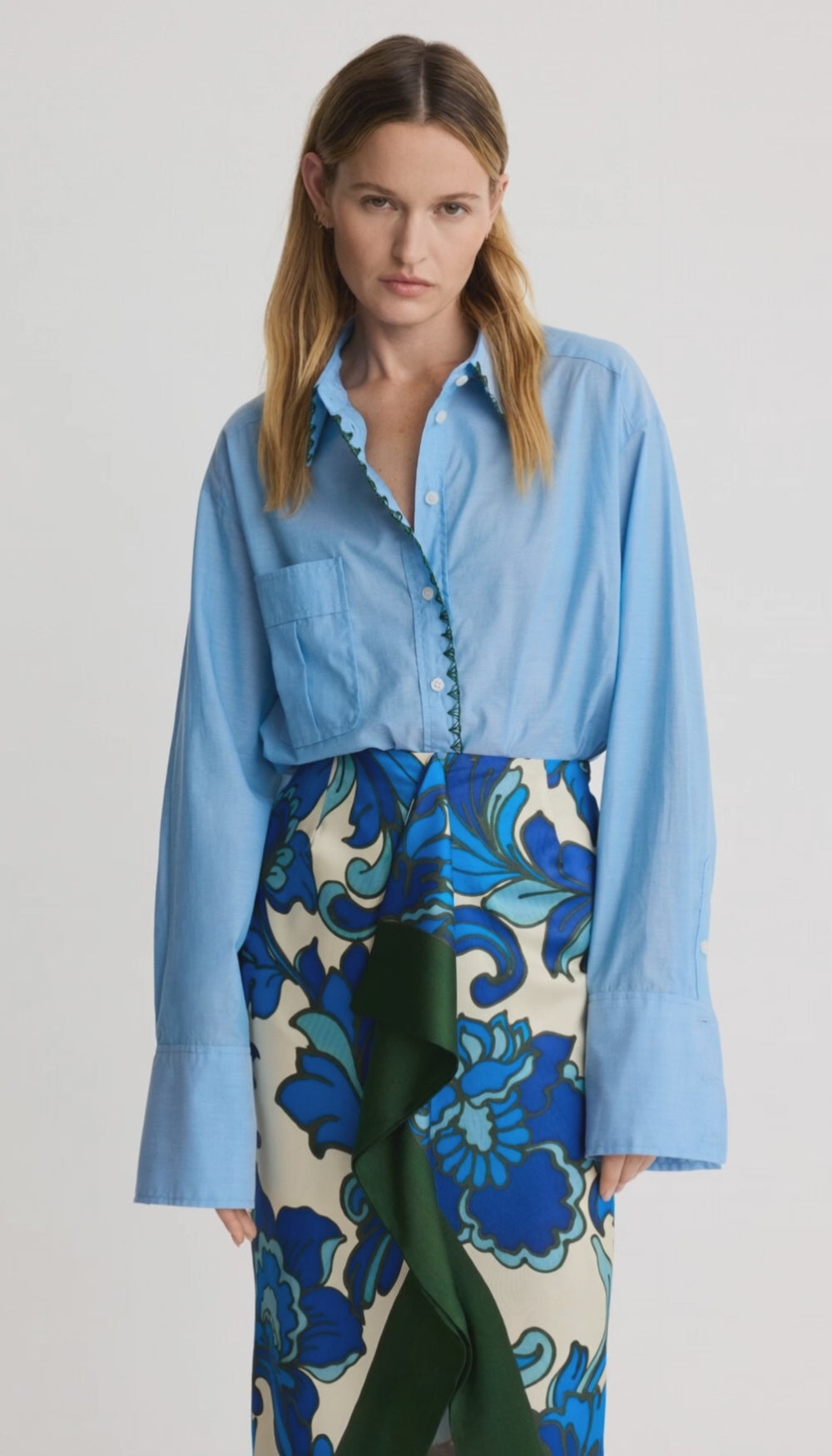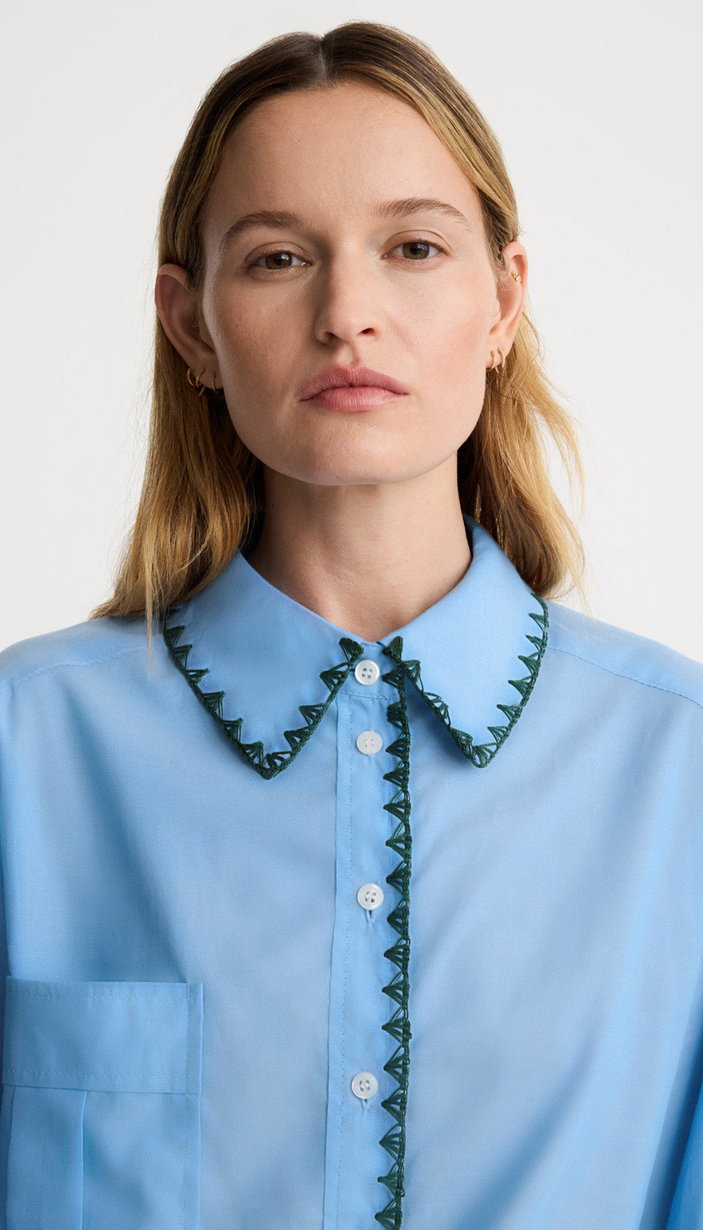 Details: A relaxed fit, this oversized shirt features an “open shell” embroidered stitch in a contrast color; a classic collar, dropped shoulder seam, patch pocket and a shirttail hem. This garment fits true to size.