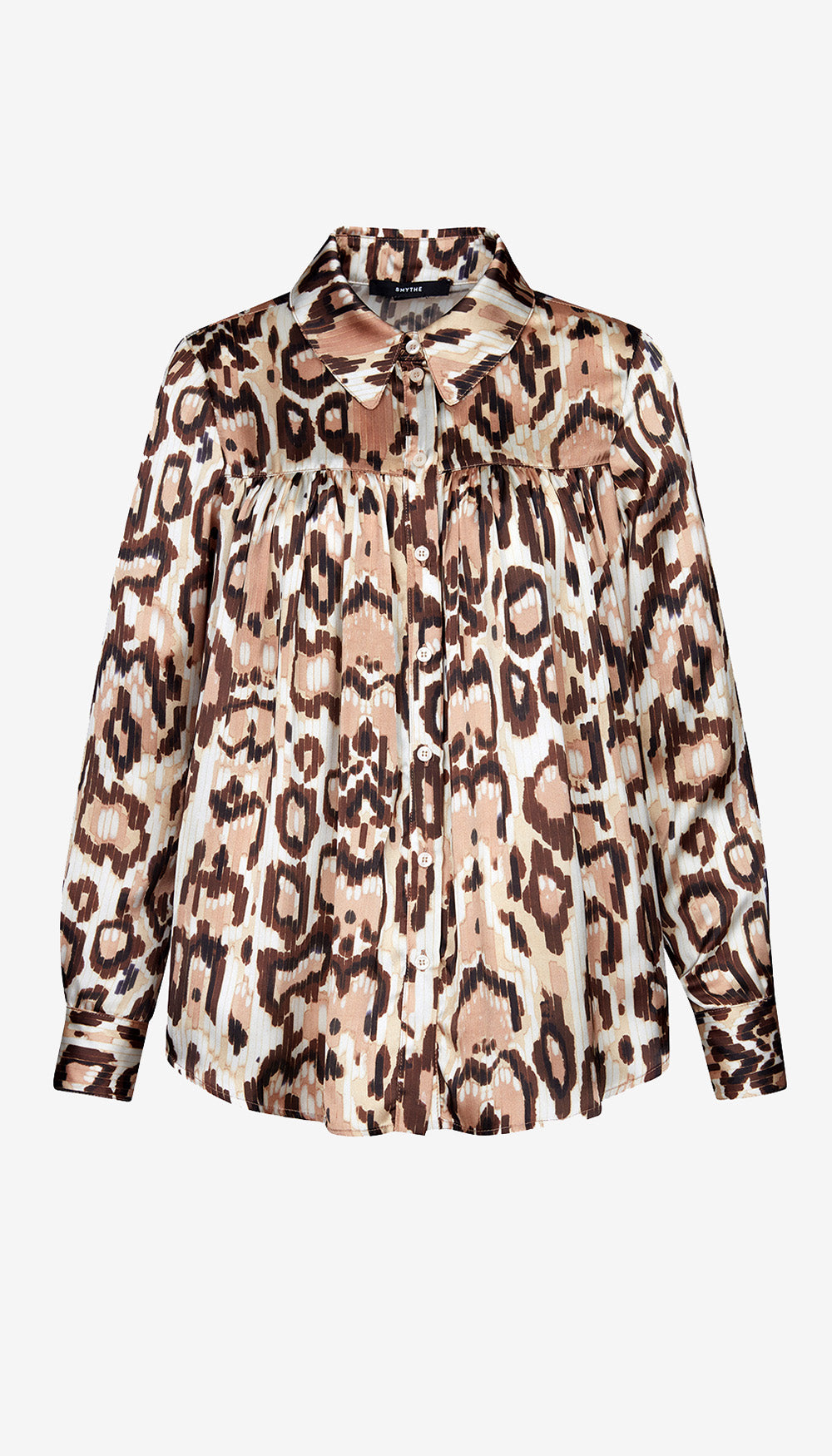 Style Notes: This silhouette fits easily under tailored blazers and allows for a tuck creating a nice blouson shape. This neutral print can be paired with almost everything, we love it with the Not A DB Blazer in Dove Plaid.