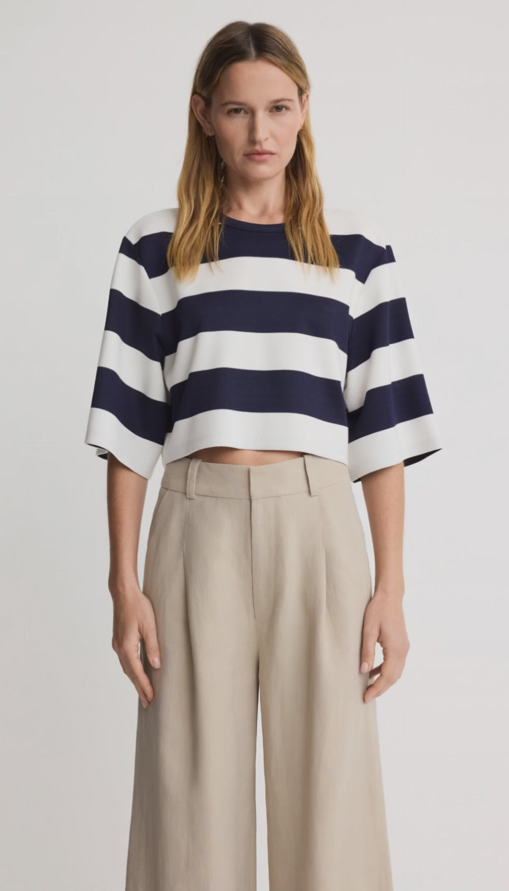 Details: Cropped and boxy, this A-line tee features a dropped armhole and wide sleeve in an awning stripe. This garment fits true to size.