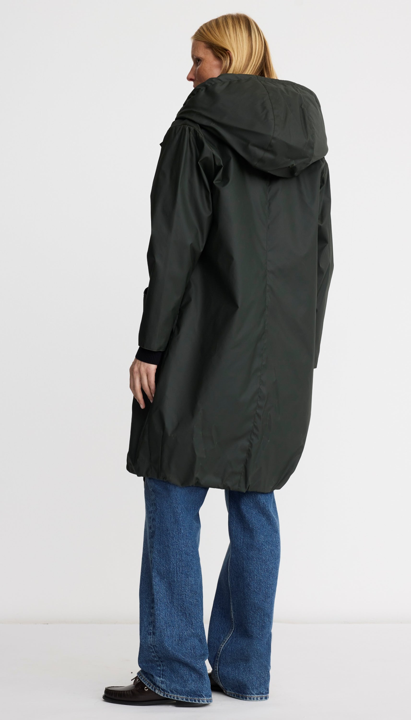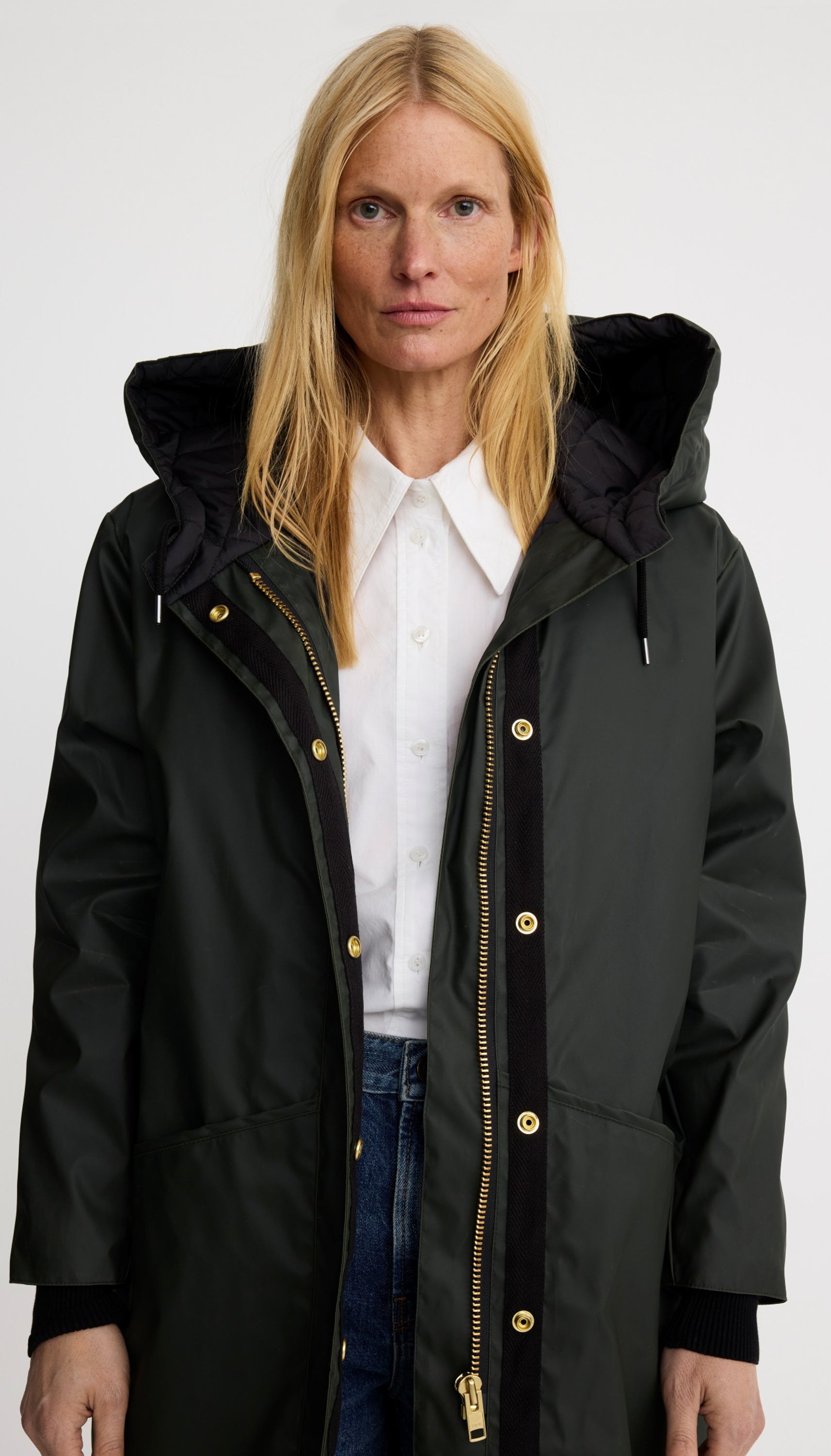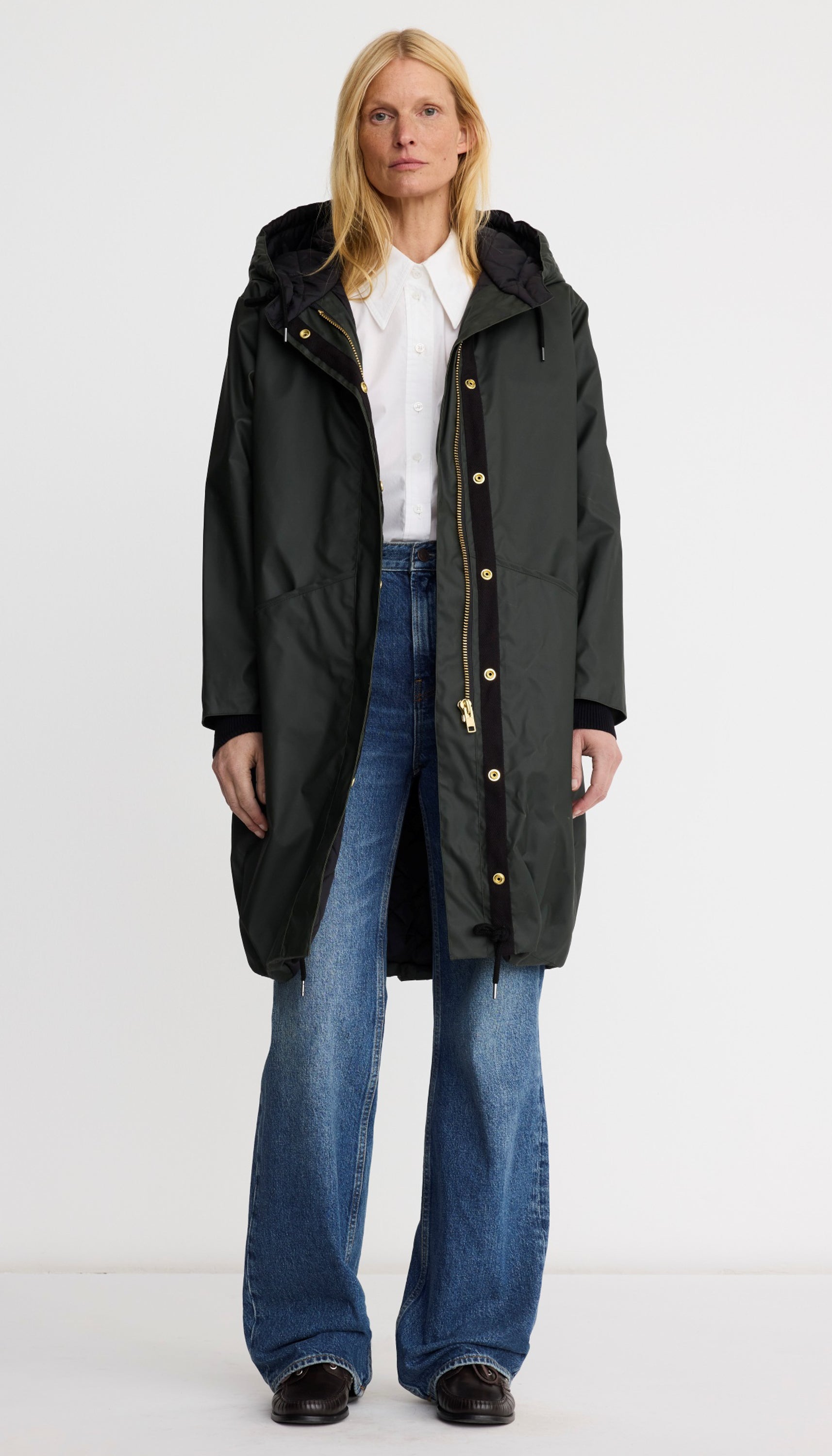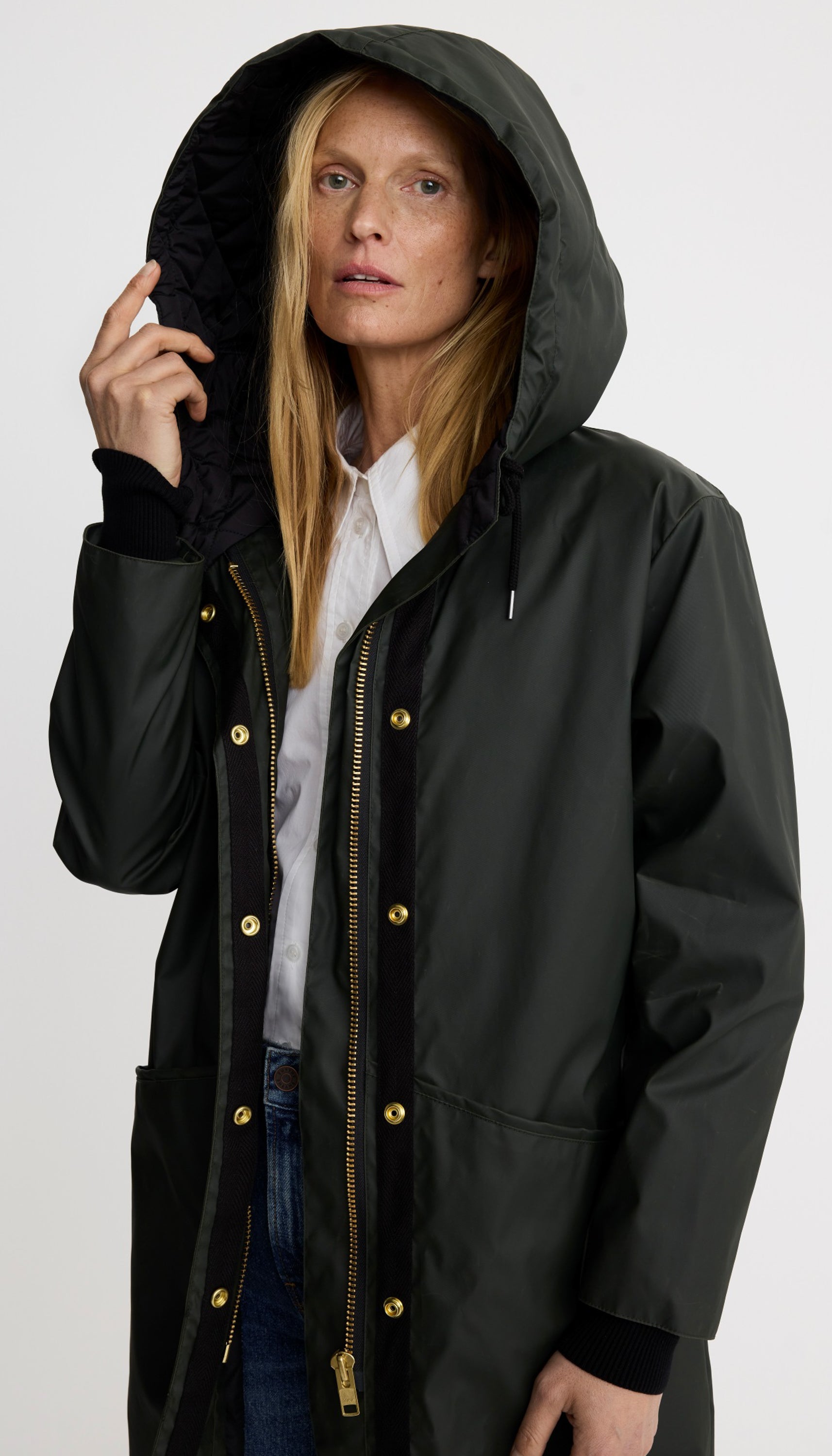 Details: A relaxed fit, this water-resistant coat features a black quilted lining, oversized pockets, and an extra-large drawstring hood that cinches. Over time, distinctive markings (the hallmark of a coated fabric) will develop and should be embraced. An interior pocket has been added to protect your phone in inclement weather. Brass hardware makes this special and SMYTHE. This garment fits true to size, take your usual size.