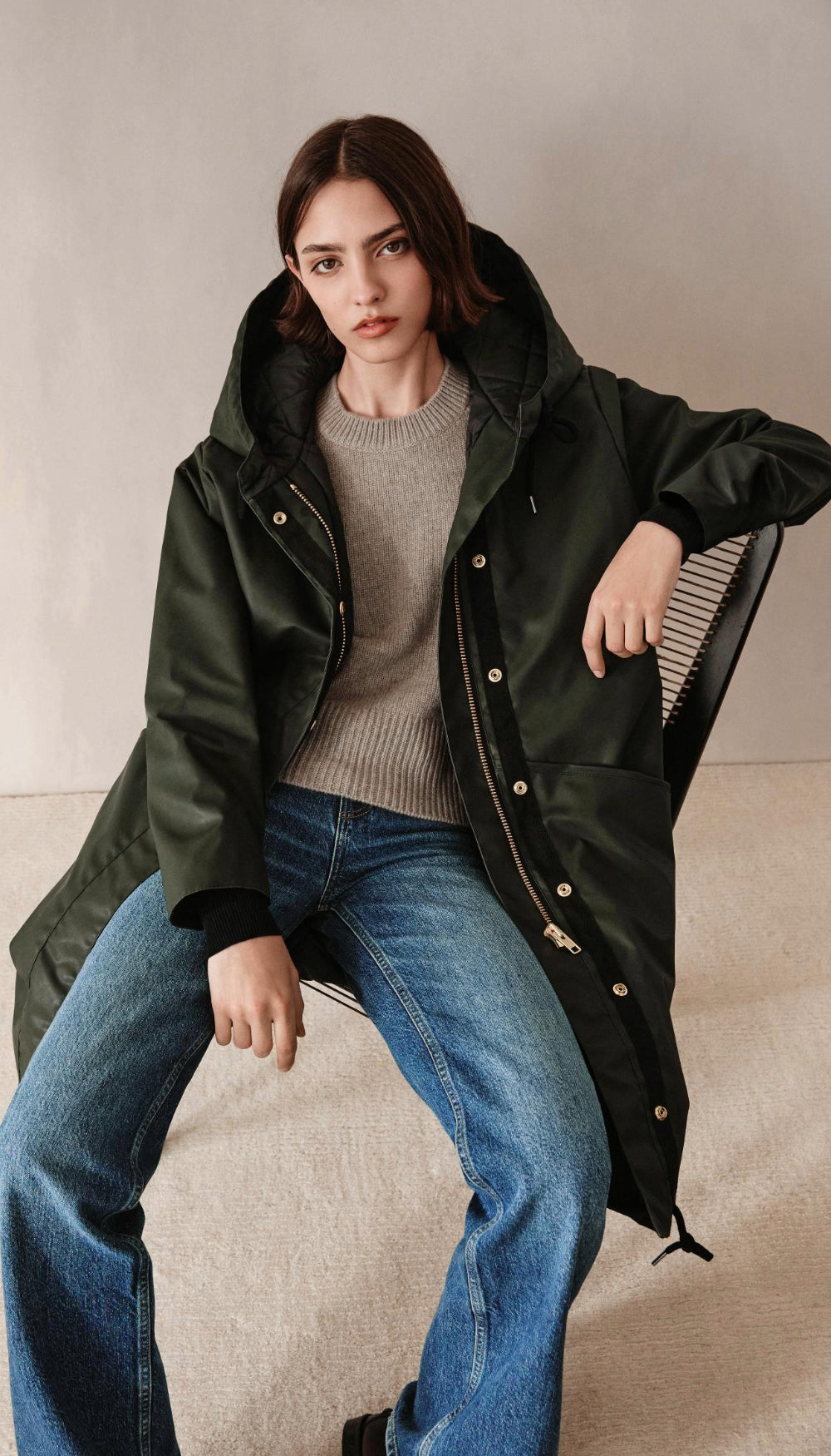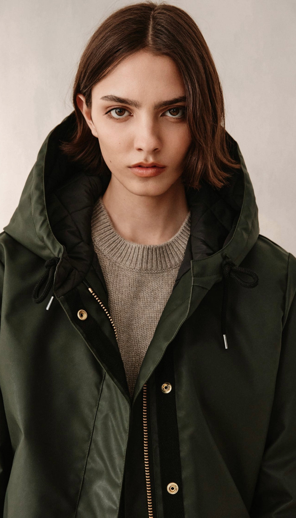 Details: A relaxed fit, this water-resistant coat features a black quilted lining, oversized pockets, and an extra-large drawstring hood that cinches. Over time, distinctive markings (the hallmark of a coated fabric) will develop and should be embraced. An interior pocket has been added to protect your phone in inclement weather. Brass hardware makes this special and SMYTHE. This garment fits true to size, take your usual size.