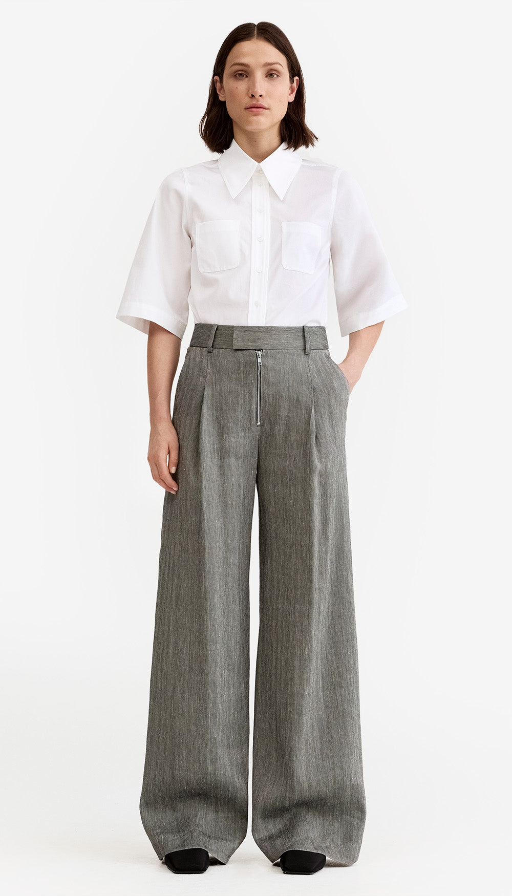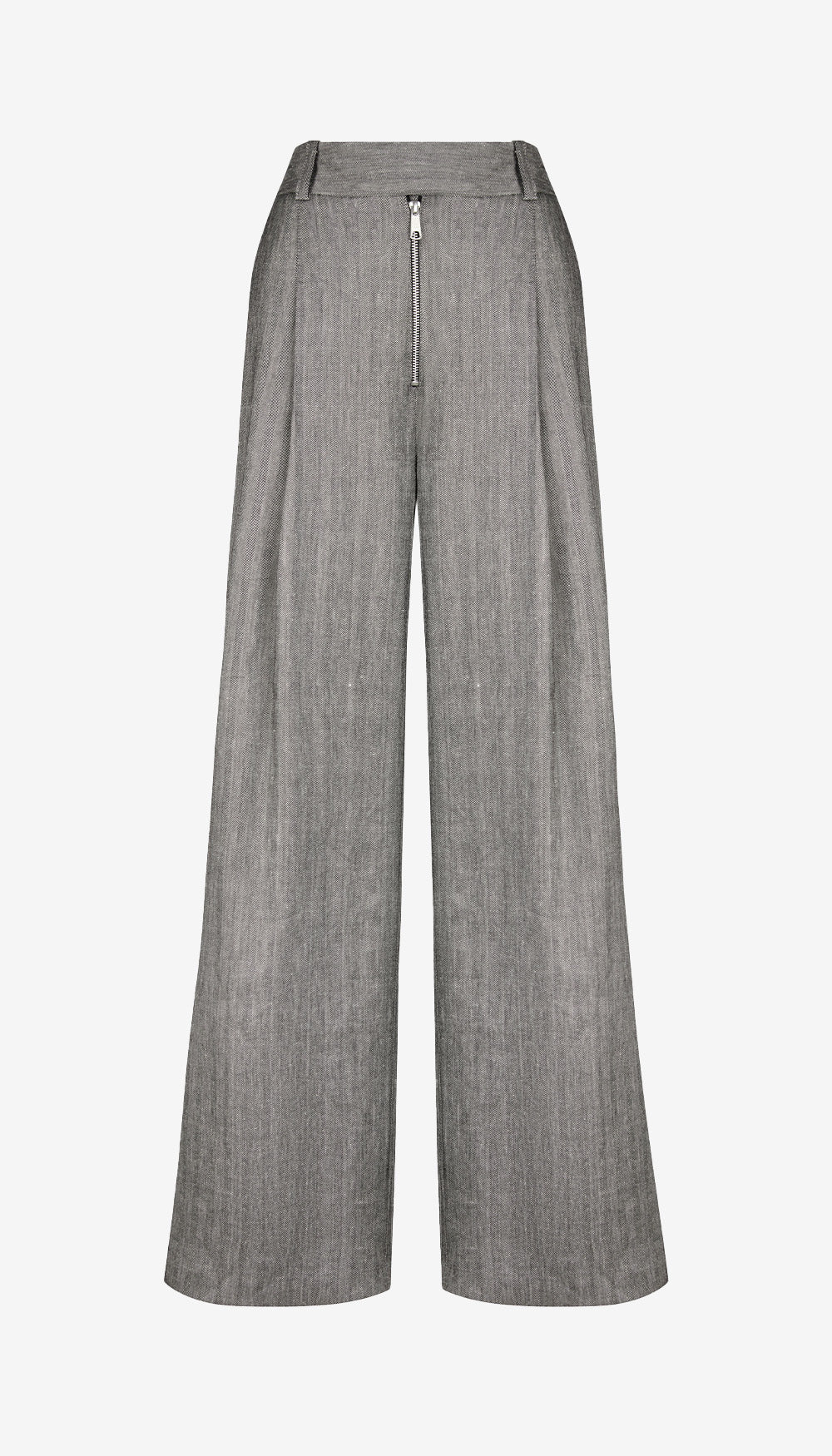 Details: Mid-rise, this full-length pant silhouette sits at the true waist and features an exposed zipper, pleats, trouser pockets, and a wide leg.