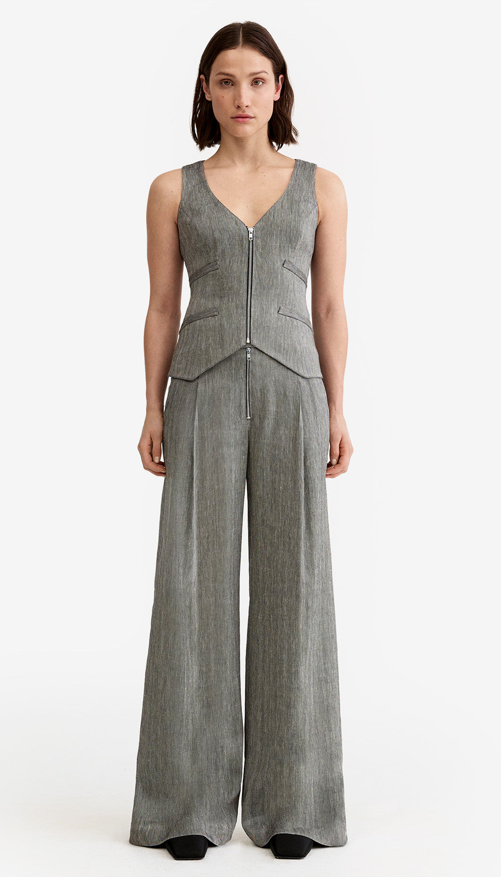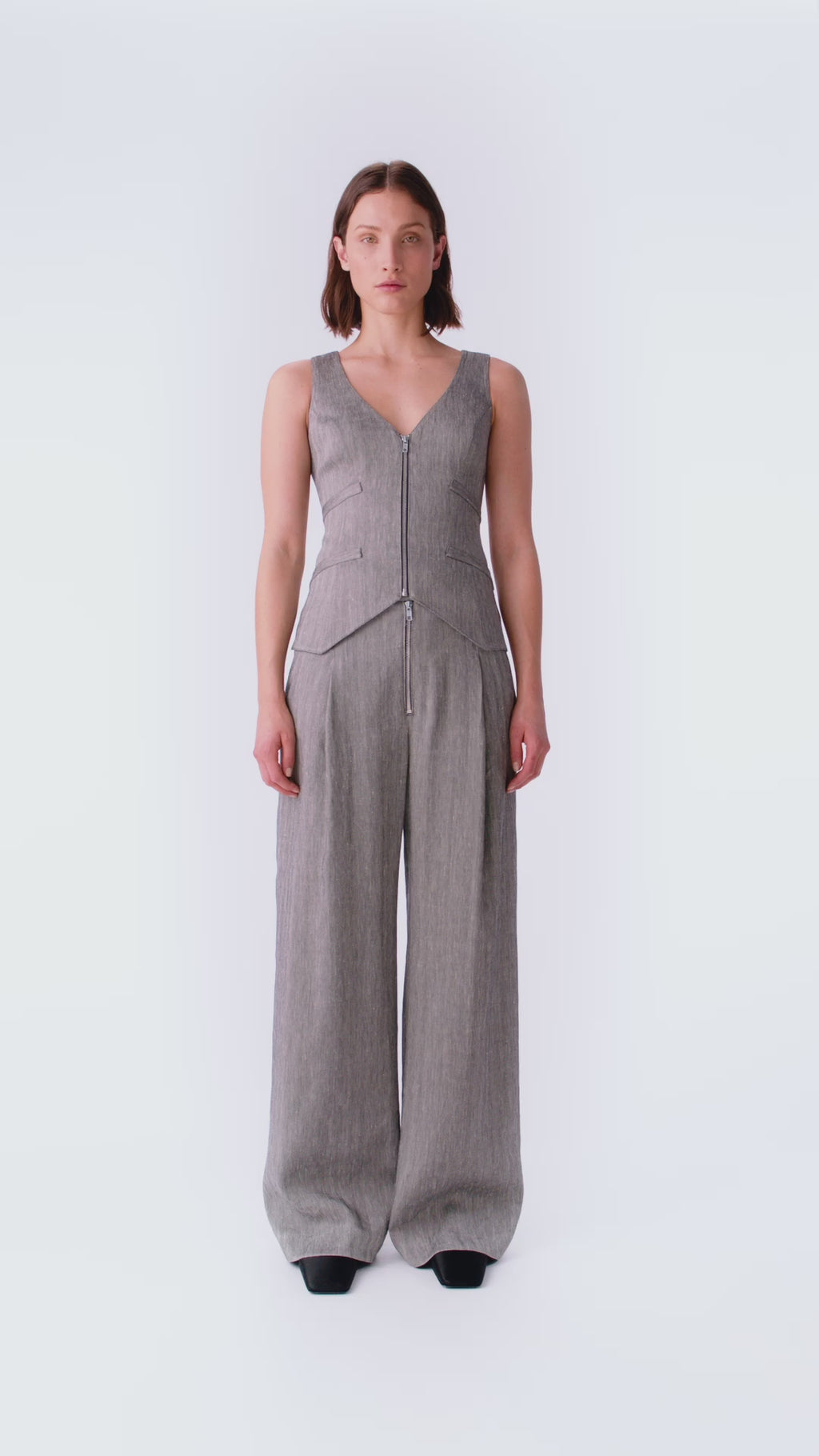 Style Notes: Wear this pant with the coordinating vest or blazer for a sleek modern suit, or let it anchor any weekday look with ease. Designed to sit at the true waist, it’s effortless to size up for a more relaxed, slouchy fit.
