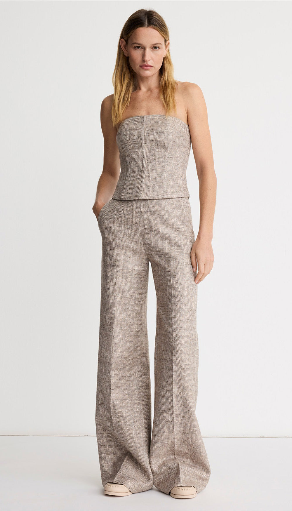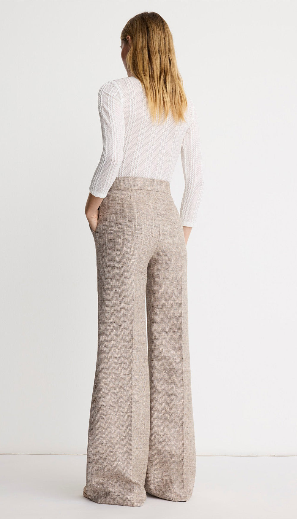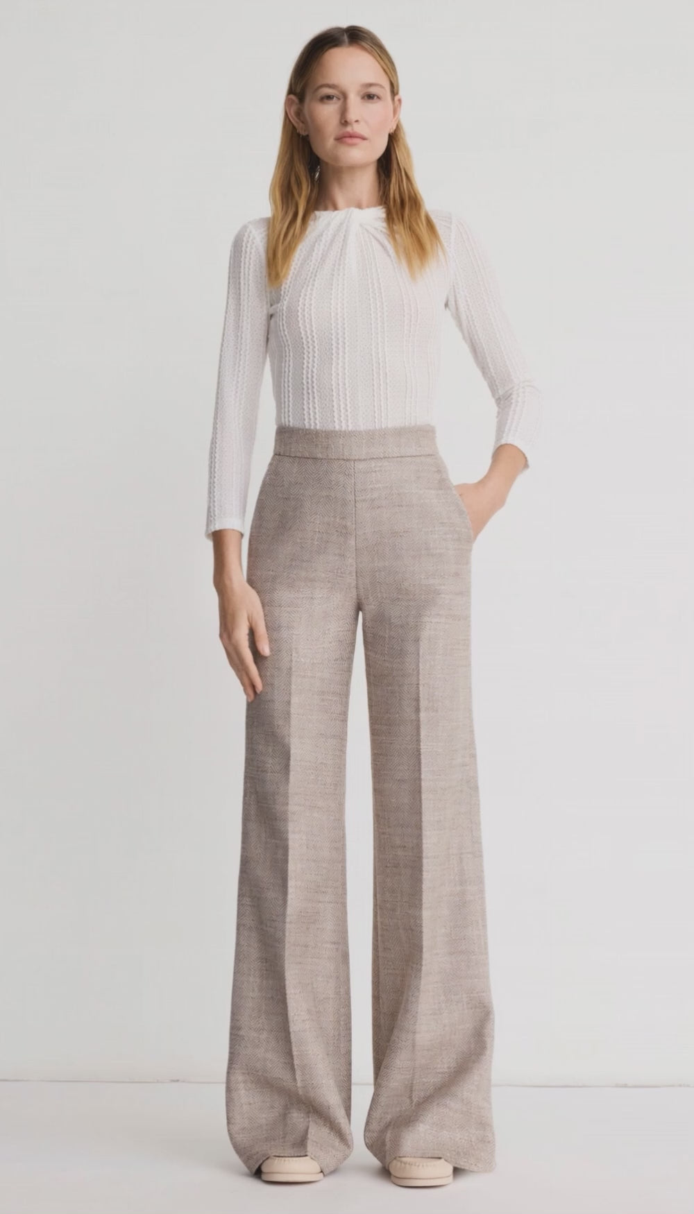Details: High-rise with a wide leg, this flat front, full-length pant silhouette is fitted through the waist and hips and features angled trouser pockets and a hidden side seam zipper closure.