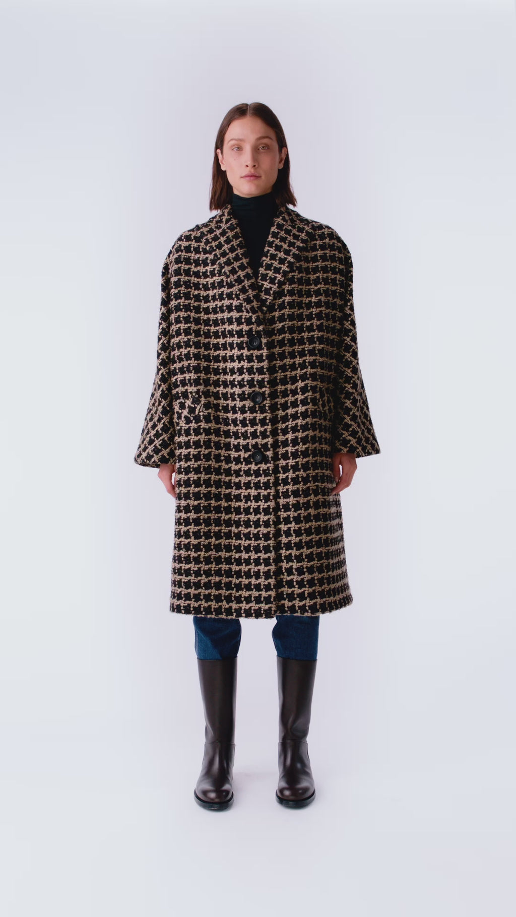 Details: An oversized fit, this louche silhouette in black grid is a head turner. This coat features a peaked lapel, swing shape and oversized welt pockets. This garment fits true to size.