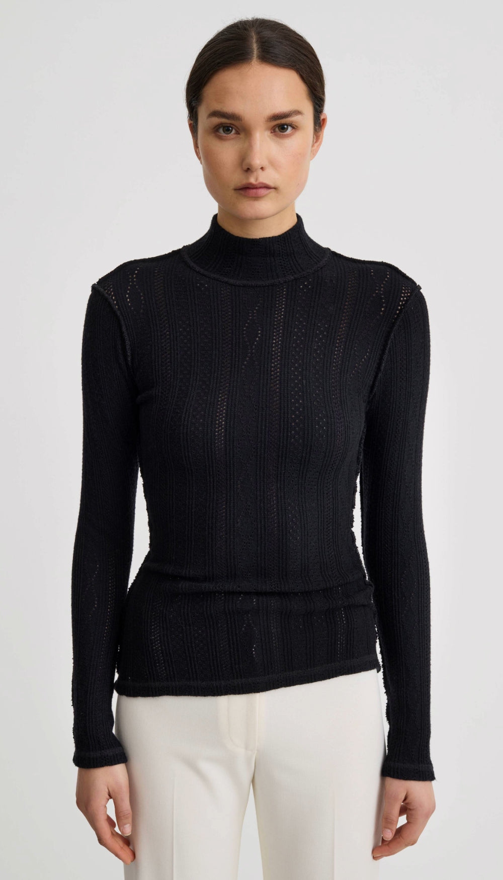 Details: A close-fitting turtleneck top, this striking black pointelle knit ends at the hip and features reverse seaming details. This garment fits true to size, take your usual size.