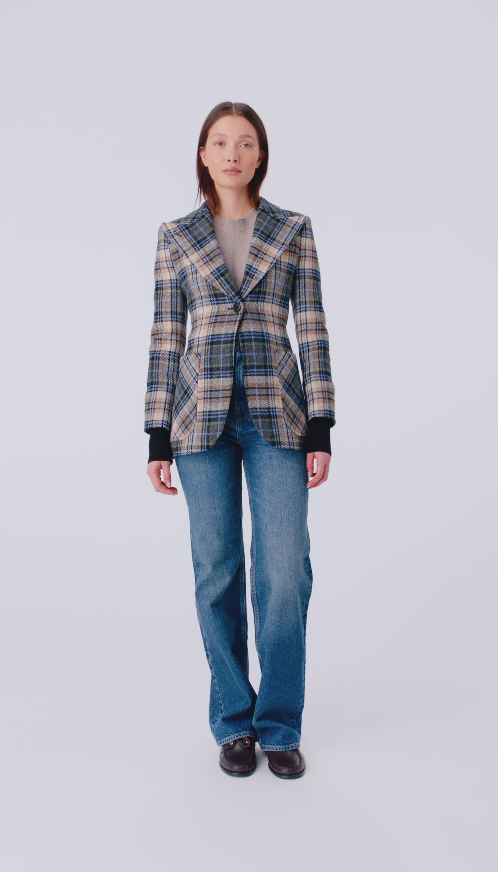 Details: Closely tailored, this longer cut away silhouette channels the 70’s with a wide peaked lapel, exaggerated bias-cut patch pockets, high back vent and a contrast black ribbed cuff detail. Curvy figures may wish to go up a size.
