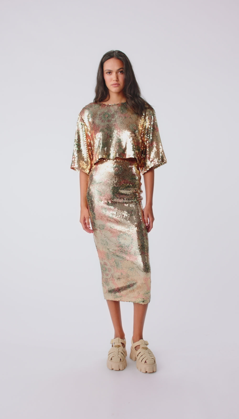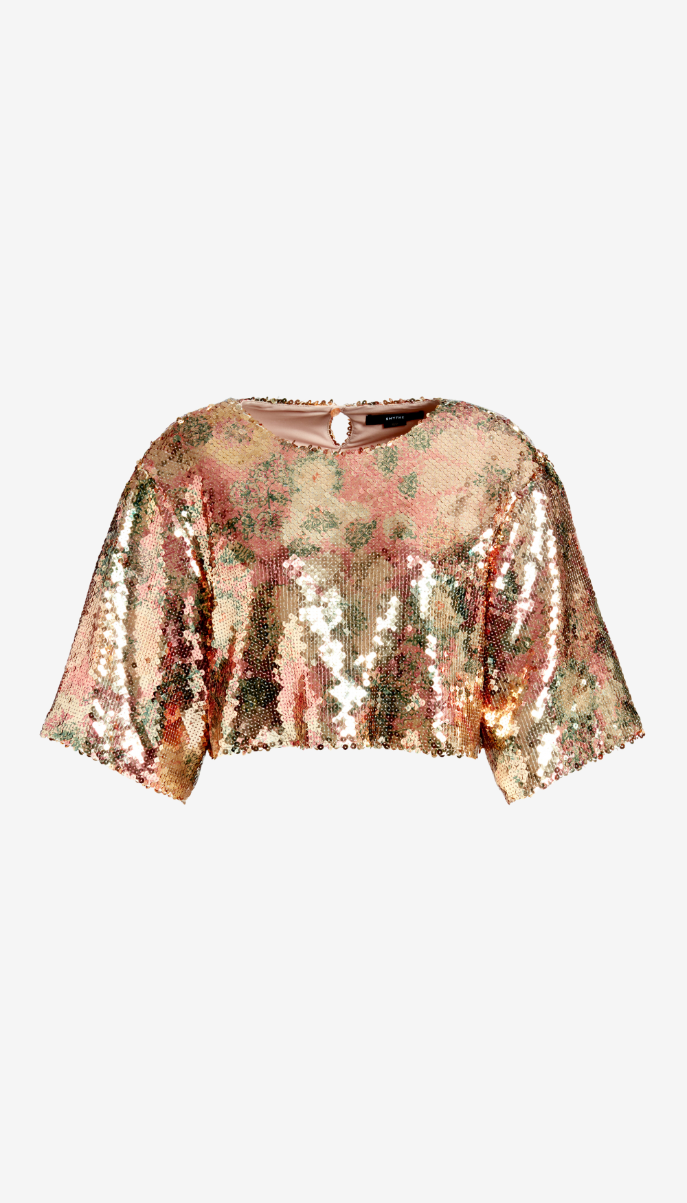 Details: Cropped and swingy, this stretch sequin pullover is fully lined, features a dropped armhole, voluminous sleeve, and back neck keyhole closure. This garment fits true to size, take your usual size.