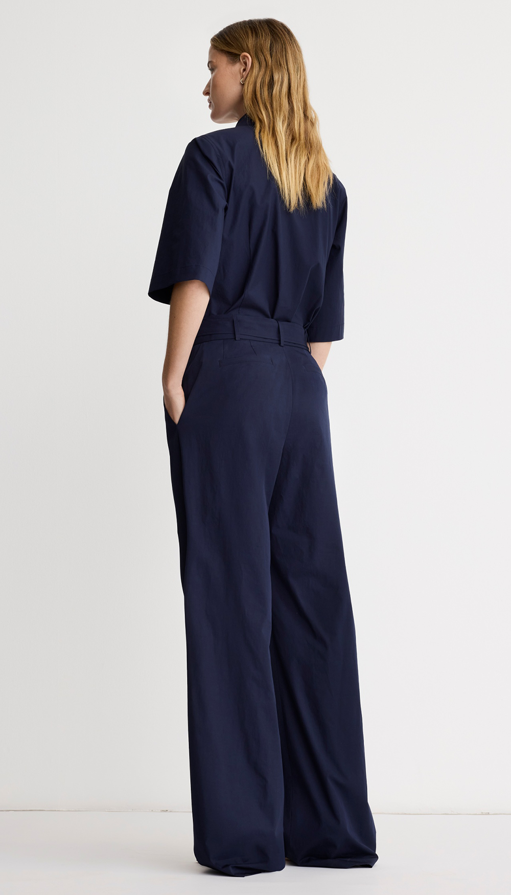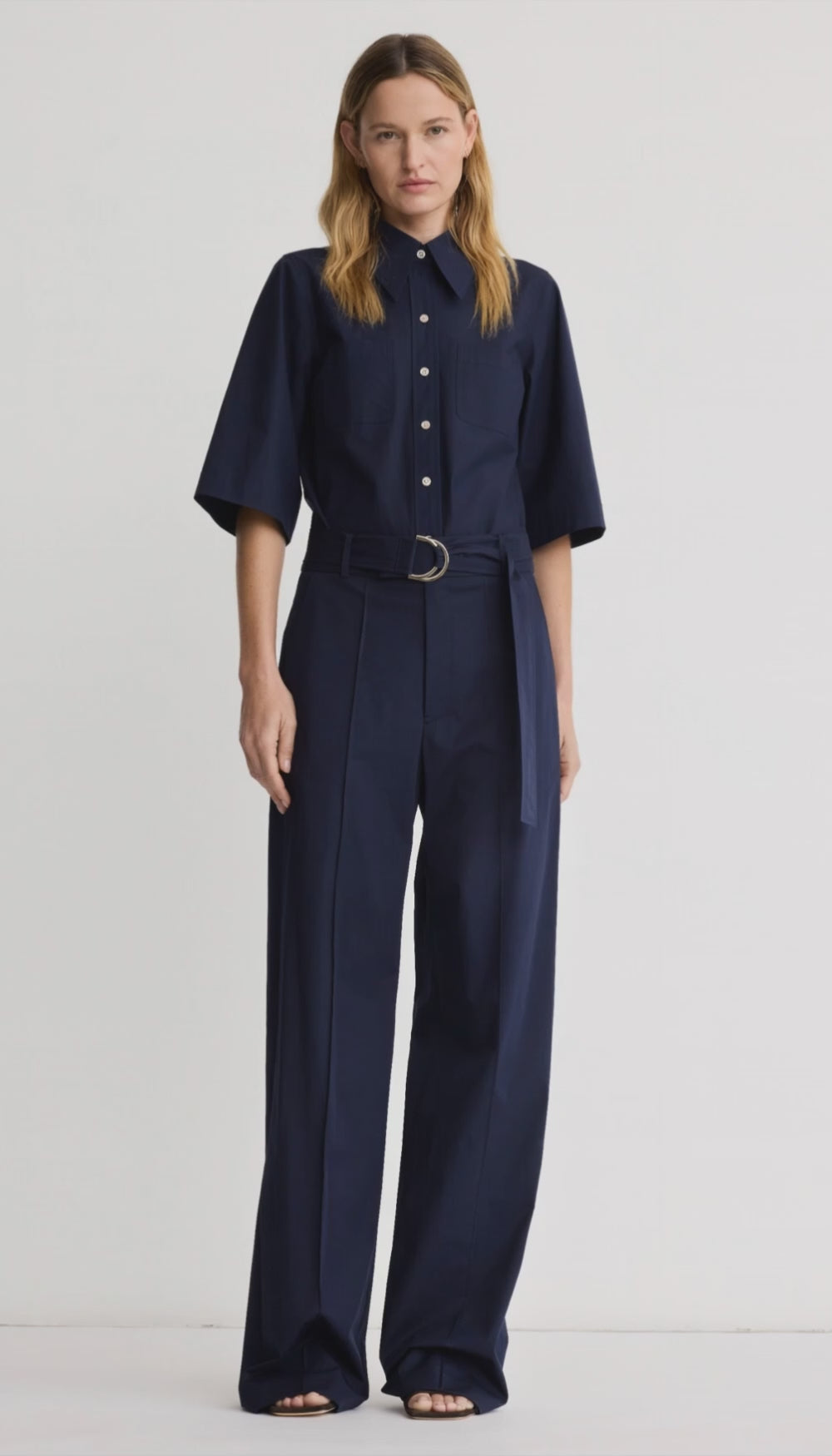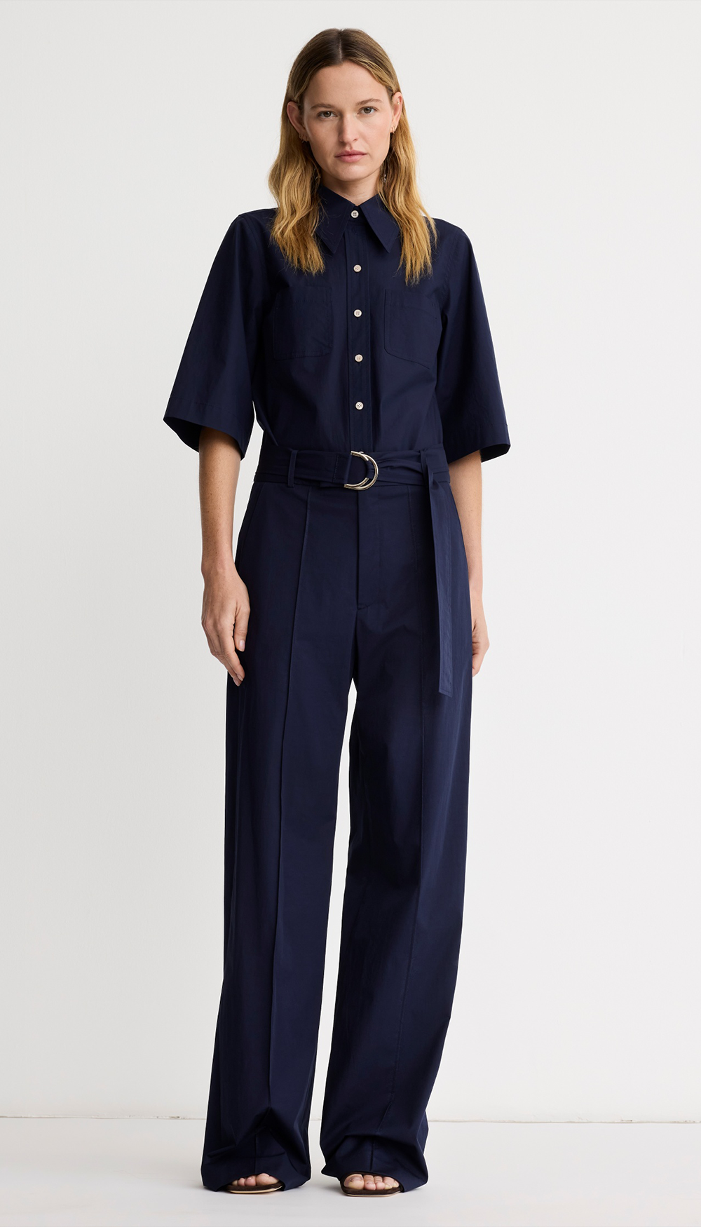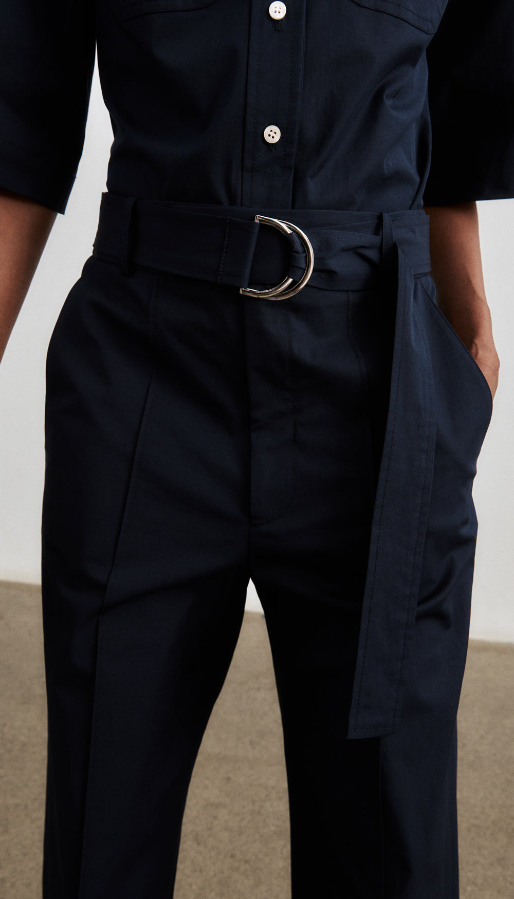 Details: Mid-rise, this full-length pant is a straight leg silhouette in a stretch poplin and features a removeable D-ring self belt, trouser pockets, and pintucks to elongate the leg.