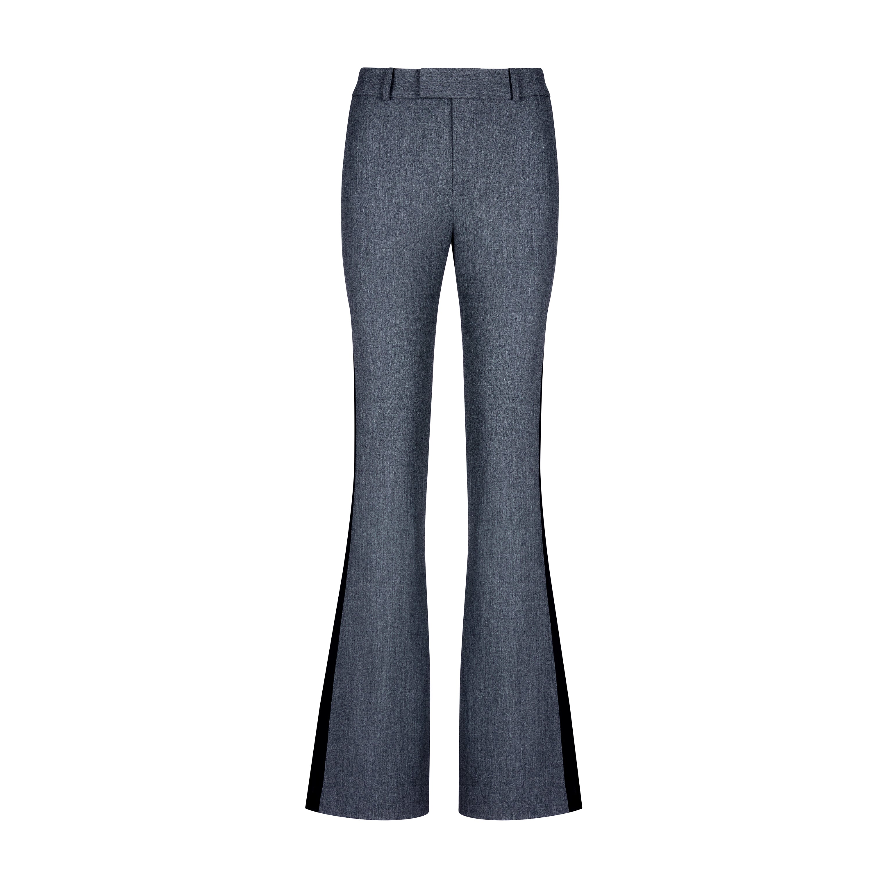 Details: Mid-rise and full-length, this stretch pant is fitted through the waist, hips and thighs, and features an elongating bootcut silhouette and contrast tuxedo stripe.