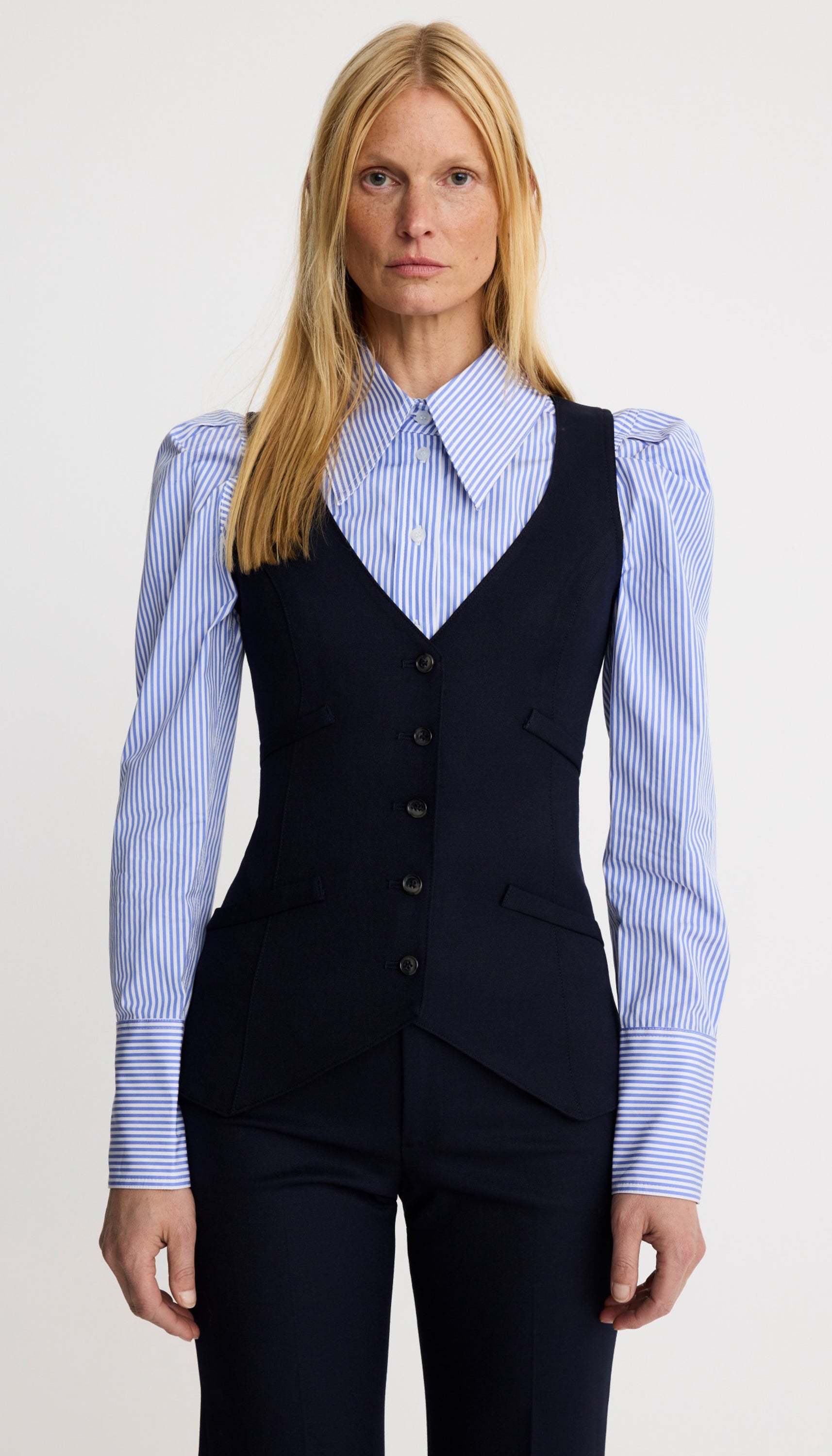 Details: Decidedly tailored, this single-breasted stretch waistcoat covers the hip and features a deep V neckline that is bra friendly. This waistcoat fits small, customers may wish to size up.