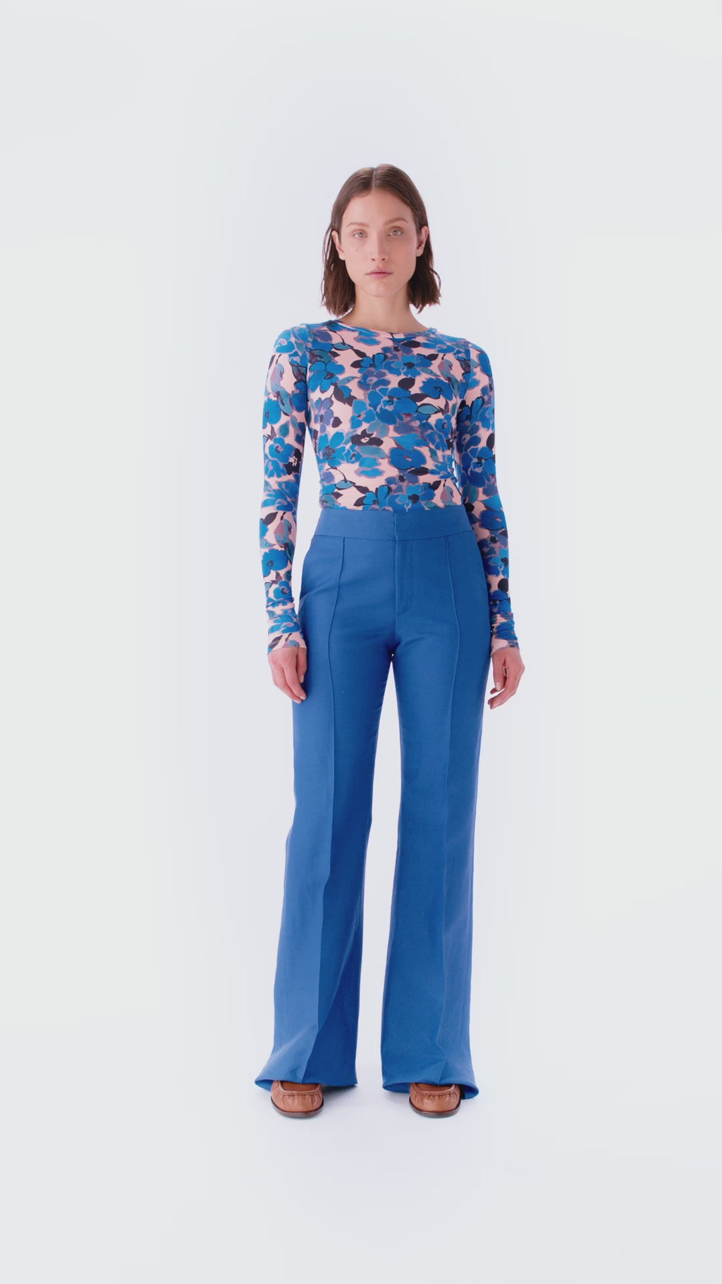 Details: Mid-rise and full-length, this trouser silhouette is fitted through the waist and hips with a wide leg and side seam pockets. Front and back pintucks elongate the leg.